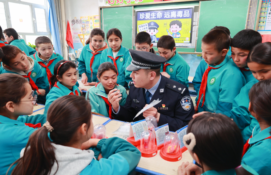 为进一步筑牢校园禁毒防线,增强青少年法治意识,3月16日,新疆维吾尔自治区阿瓦提县公安局阿依巴格镇派出所民警走进辖区校园开展禁毒宣传活动。民警通过展示毒品仿真模型、播放禁毒宣传视频、互动交流等方式,向同学们讲解真实案例及禁毒知识,增强学生识毒、防毒、拒毒的意识和能力,守护青少年健康成长。(记者 潘从武 通讯员 胡国华 摄)