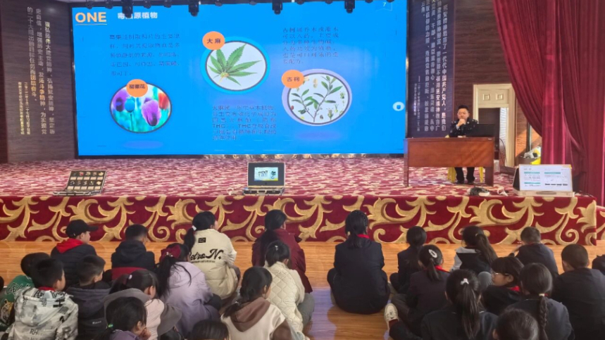 "宣讲团工作人员通过禁毒主题宣讲、仿真毒品模型展示、宣传资料发放、互动问答等形式,用通俗易懂的语言向师生讲解毒品的种类、危害及相关法律法规,结合真实案例警示大家远离毒品。"